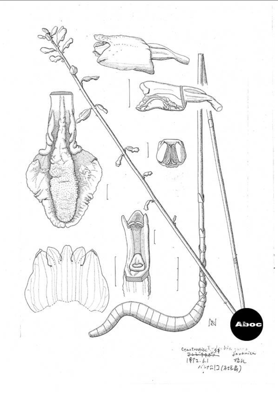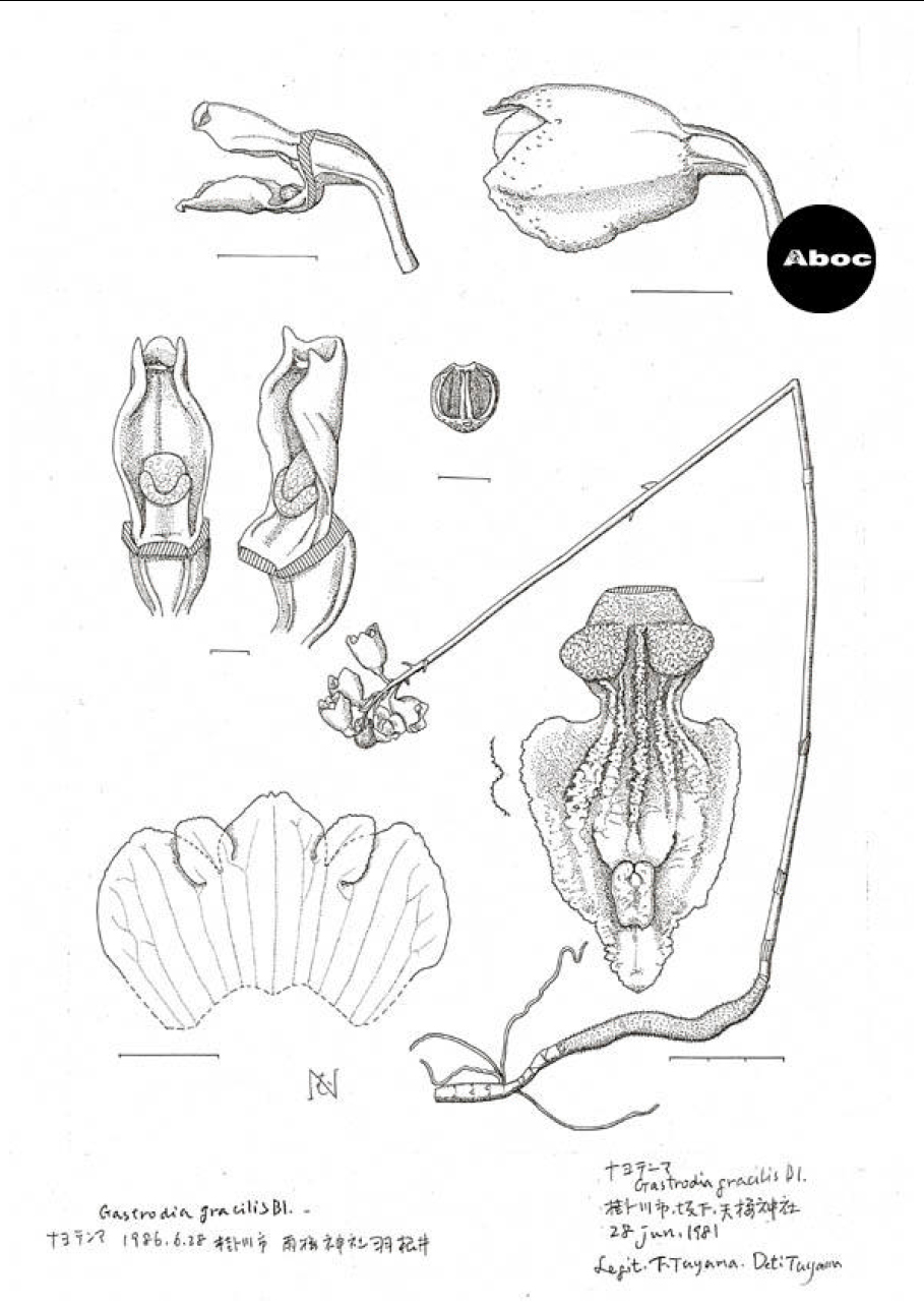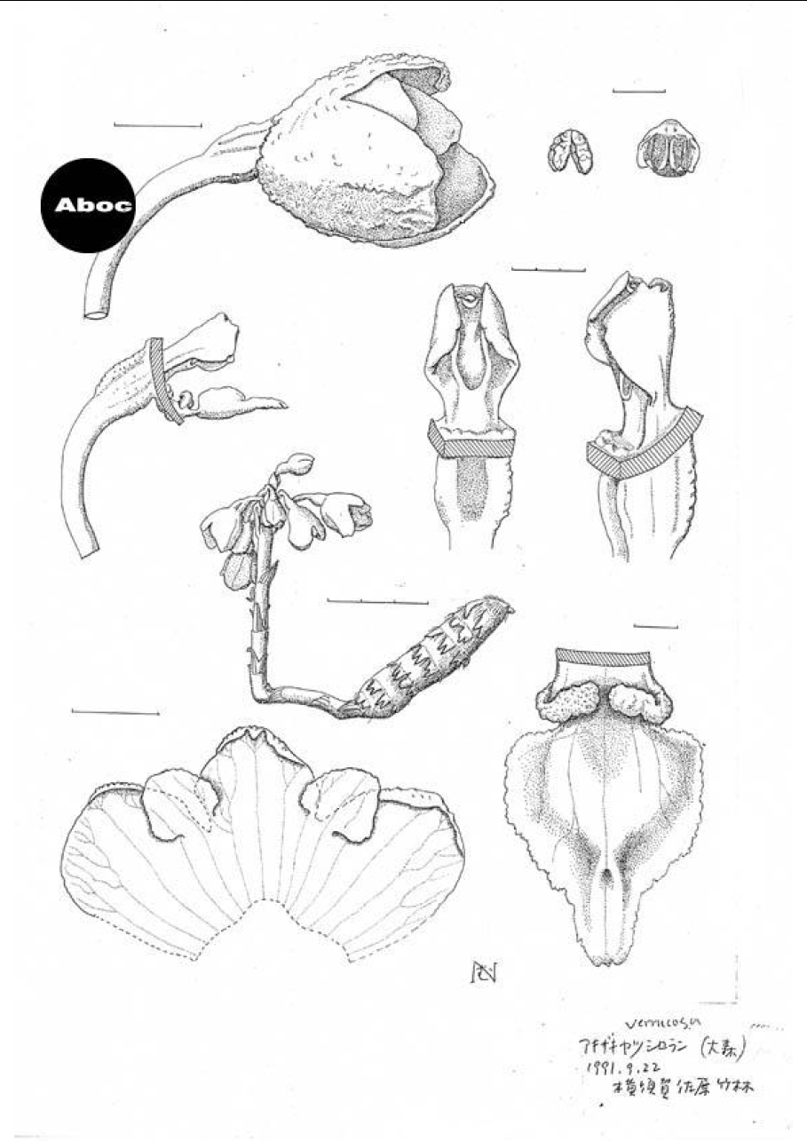 今回ここに主に紹介するのは、彼女のいまや最もビビッドな仕事の中核をなす科学的な植物画である。これらはすべて植物の乾燥標本から描かれたもので、植物の構造を熟知している彼女ならではのものであるが、注目すべきは唇弁(ラン科植物の分類に重要な器官)の描き方である。本来、立体的な唇弁であっても、形態的な特徴を表現するためには平面的に展開して描くことになるが、どうしても展開しきれずにしわになる部分が出る。彼女はそのしわも忠実に描く。すなわち描画に嘘がないということである。このようなことも研究者に信頼されるゆえんなのである。