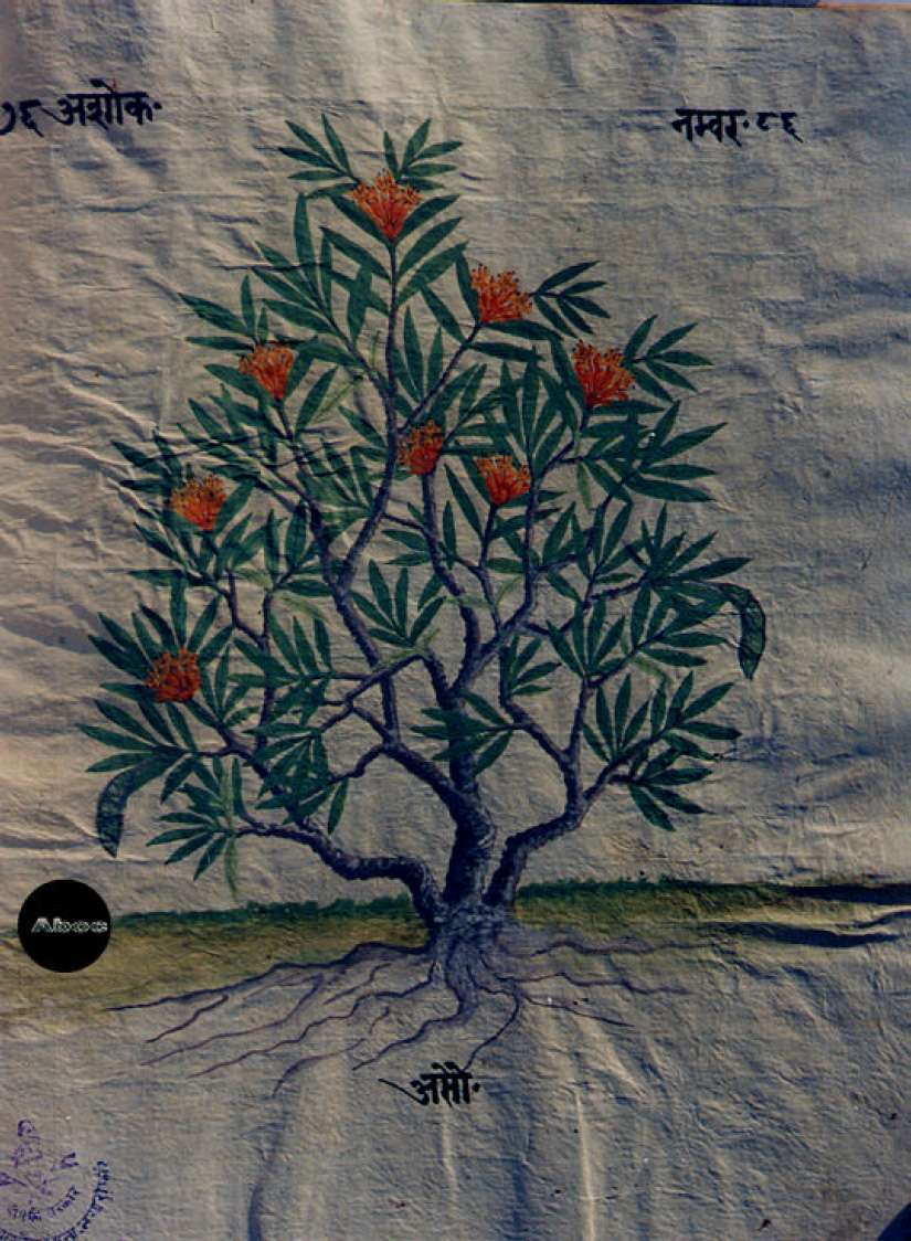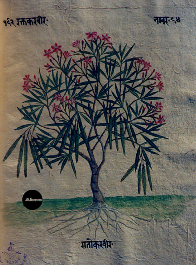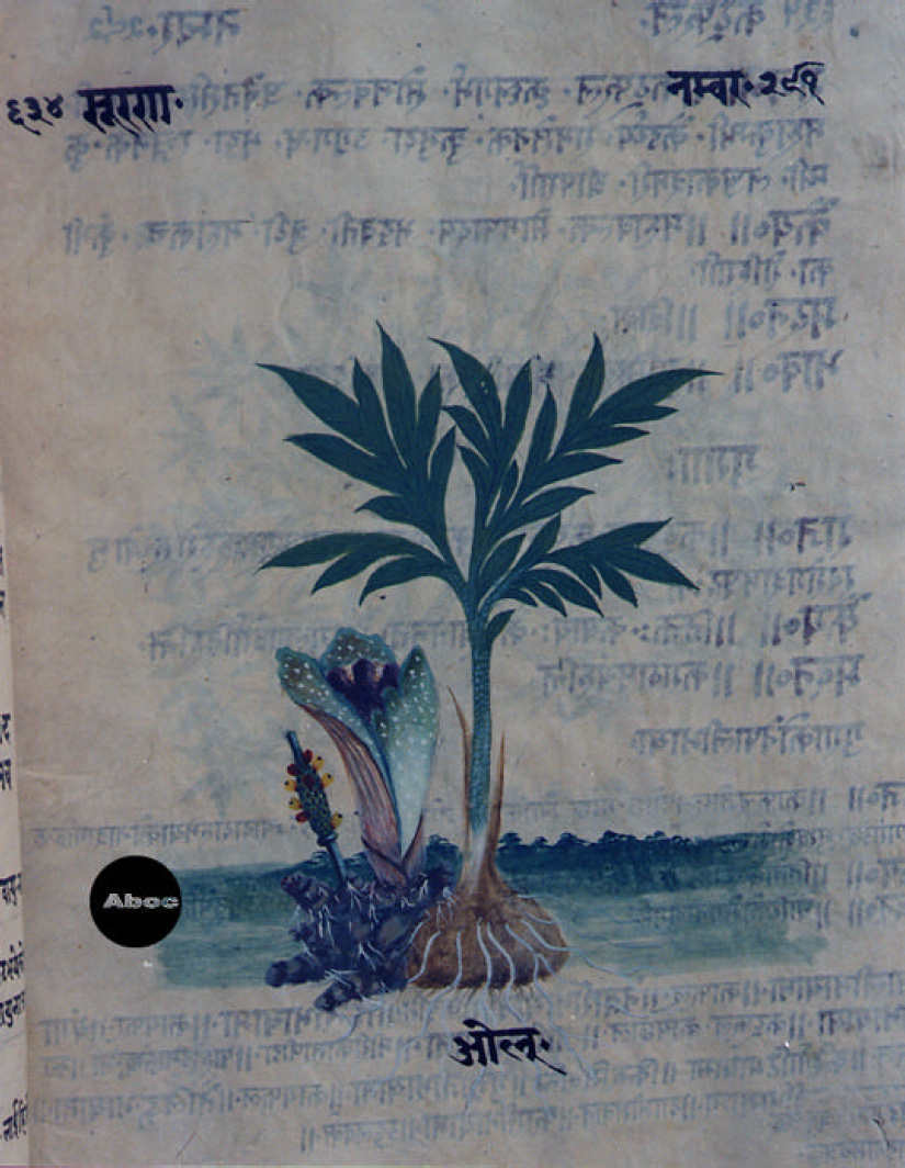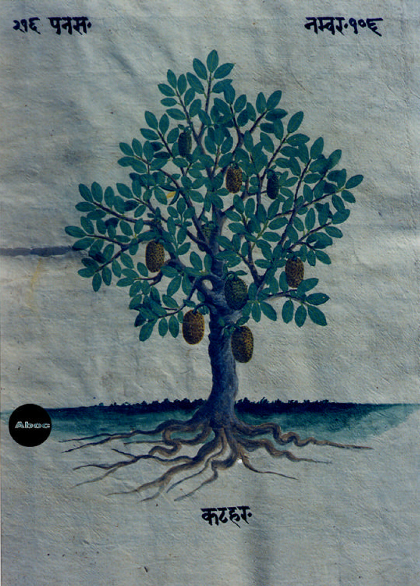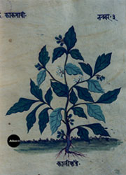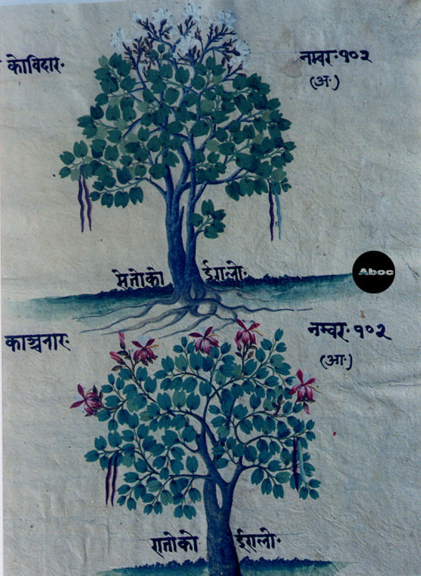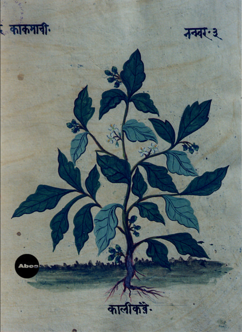 本書は手書きのアーユル・ヴェーダ本草図譜で、10巻より成る。そのうち8巻は植物篇で約800種類を扱い、1巻は動物篇で約100種類、1巻は鉱物篇で約70種類が扱われている。植物篇は1頁に1種類の植物が、葉はもちろん、花と実と根が必ず描かれ、生育場所を示す背景も描き込まれている。すべて着色図である。樹木が多いがその他の有用植物、とくに野菜や穀類は描写が精細で、たくさんの品種が紹介されている。イネは18種類、サトウキビは13種類も描かれている。ただし、区別がよくわからないものもある。裏面にはその植物に関する古典の記事がサンスクリット文とネパール文で記され、多くの言語によるその植物名が列記されている。アーユル・ヴェーダはインドに伝わる伝統医学の体系で、体全体の調和を保って健康に長寿を保つことに基本が置かれる。記事を読んでみると、それぞれの植物の効能や適用症もさることながら、西洋医学とは異なった考え方があることがわかり、興味深い。もっとも、図と記事が対応しているかどうかは検討を要する。