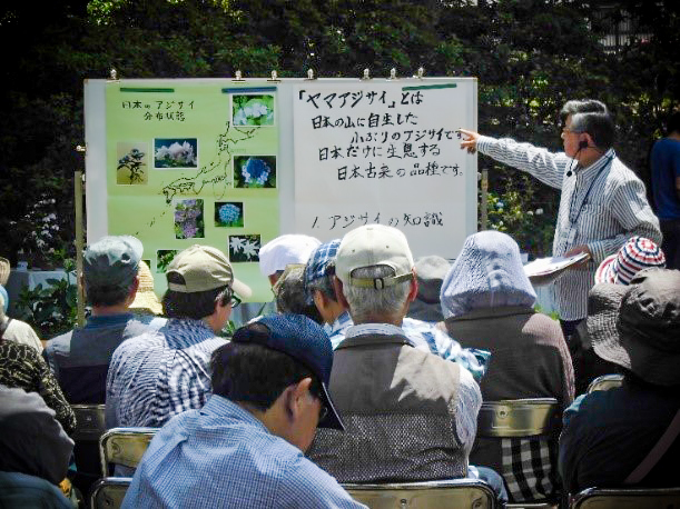 「日本の自生アジサイ展」は鎌倉市後援のもと2000年から開催され、今年で20回目を迎えた。国内に自生するヤマアジサイを中心に新品種を含め毎年200種類以上の品種を展示する。会員が育てた5号鉢仕立てのヤマアジサイを中心に、北海道から沖縄までの県別・品種名とともに紹介する。期間中は展示品種の説明やアジサイの手軽な育て方の講習会を行っている。