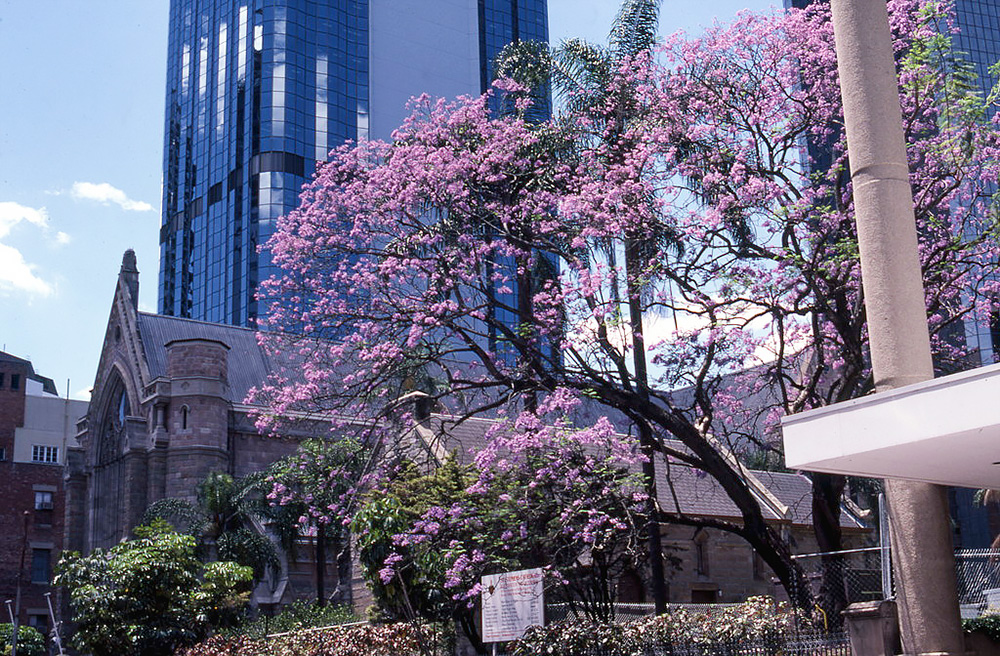 ジャカランダは南米原産で、薄紫色の花を枝いっぱいにつけます。その花はキリに似た形で高尚なイメージがあります。遠くから眺めると紫の雲がたなびくようなので、紫雲木という和名もあるほどです。このジャカランダには、少し乾燥気味で、やや涼しい所が適しているようです。南アフリカの首都プレトリアや東アフリカ・ケニアの首都ナイロビのジャカランダは有名で、南米の原産地よりも美しく咲きます。ここは赤道直下ですが高地なので、気候がやや冷涼なせいでしょう。