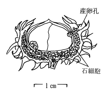 この虫について、東京環境工科専門学校の薄葉 重校長に尋ねてみた。薄葉先生は両国高校を定年の後この学校へ来られた方で、虫こぶの専門家として知られており、「虫こぶ入門」「虫こぶハンドブック」などの著書があるが、野生生物についての広範な知識をもつ博物学者で、こういうとき頼りになる。虫はゾウムシ(ハイイロチョッキリゾウムシ)で、堅果の表面がまだ柔らかいうちに、あの長い吻を錐のように使って穴をあけて産卵し、それから枝をかじって切り落とす。だから切り口がきれいなのだ。地面に落ちた枝の中で幼虫は堅果の中身を食い、それから脱出して地中で蛹となって羽化する。…というお話しだった。親が枝を切り落としてくれなければ、幼虫は枝先から糸にぶら下がって地面に下りねばならない。ぶら下がっている間に鳥や昆虫に食われてしまうおそれがある。そんな種類もいそうに思うが、親が切り落とすか、樹上で蛹になるかのどちらからしい。「親切」という言葉は、これに由来するのだろうか?虫と植物の関係は日常いろいろな場面で出会うが、送粉や蝶の食草やオトシブミくらいはなんとなく認識しているものの、葉切り蜂や葉潜り蠅あたりになると、出会う頻度は高いのについ見過ごしてしまう。ましてこういう落枝は、拾って見たところで変わりはなく、首をひねるだけである。若い総苞の断面を見たのは初めてだが、その内面は堅果の底部と共に、カステラの底のザラメの集合のような、白色がかった不揃いな大きさの石細胞(だろうと思う)が、ギッシリ詰まっていた。