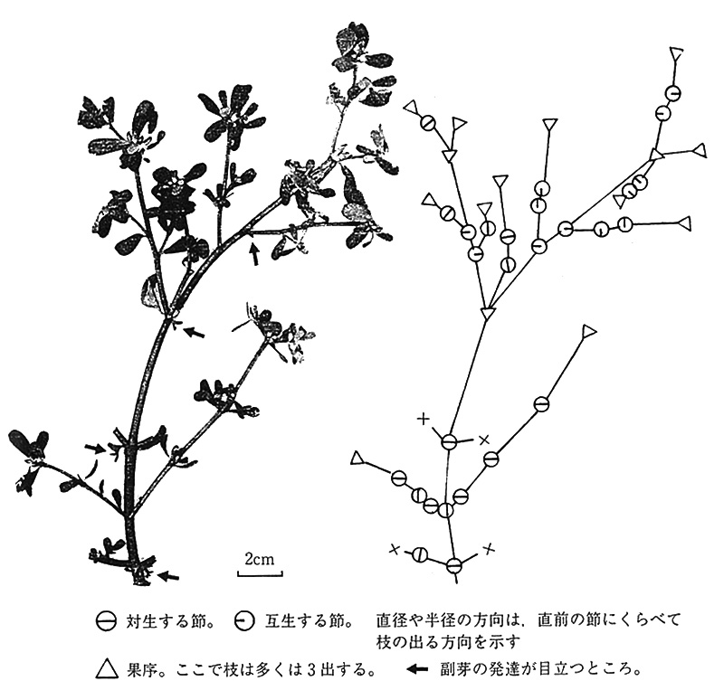 枝のことはどこにも書いてないが、枝は葉腋から出るものと考えれば、枝の出方は葉の出方を反映しているはずである。枝は基部の方では対生で、節ごとに90度ズレているように見える。「ように見える」とあいまいなのは、茎も枝も地面に平たく展開しているうえ、茎が肉質で太いので、90度の開度を追いかるのがむづかしいのだ。でもなんとか追いかけられるところはある。節によっては、左右の枝が少しズレて出ているところもある。とくに果序から先の枝ではすごく離れていて、互生というよりほかはないところもあるが、互生している2本の枝は、ちょうど 180度の関係にあり、対生がズレたと考えられなくもない。枝は3~4節の後に茎頂に花を複数つけ(いまは果序)、その基部から通常は枝が3本出ている。そこから先は2-3 節目でまた花がつくが、もう枝は出さず、葉が群がっていて、束生状態になる。葉が互生しているように見えるところをよく見ると、反対側の葉が退化して鱗片状になっていることが多い。したがって、スベリヒユは基本的には対生と言ってよかろう。ときに互生もあるという程度である。