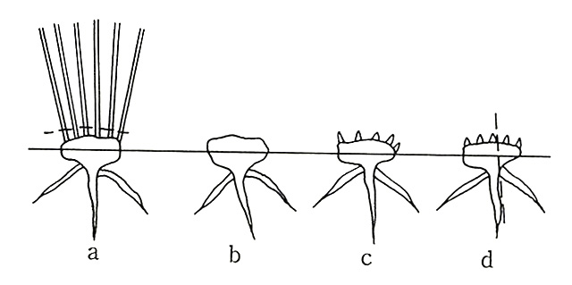 西岡氏の報告はブータンの栽培ウルシについて、この他にも興味のあることがらを含んでいるので書きとめておく。ウルシ樹の仕立て方は西ブータンに於てはブッシュ形である。つまり関東地方のコナラやクヌギの薪炭林のように、ゴツゴツした根株から枝がたくさん出ているという形だろう(Fig. 1-a)。株をふやすには、採漆のために枝を伐採した残りの根株を、鍬やナイフで分割して、いわば株分けを行なう(Fig. 1-d)。この分け方は日本でウルシをふやす時行なわれる根分けと似ているようだ。