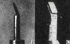 まずラミネート紙であるが、これは市販品があることを知った。きわめて薄い和紙又は化繊紙の片面にポリエチレンをラミネートしたもので、南国パルプ工業の製品はヒートロンとよばれ、東京加工紙製のものはラミコートという。この種の紙は最中などの和菓子の包紙によく用いられているので、少量ならこれを利用できる。紙質はヒートロンではPCS 30g/㎡が適当だった。この紙は何枚も重ねると互に滑ってしまって切り難い欠点があり、後述のような商品としてテープを製作する場合には幅7mmより細くは切れない。テープを手製するならば4mmと8mmの2種類を用意するとよい(図D、E)。次にハンダ鎮であるが60-80Wのラジオ用がよい。先の太いものは先端を約30°に斜に削り、面を長方形にヤスリで仕上げる(図C)。先が細い鎮は先端をたたきつぶしてから角度をつけて曲げる。先端は約90°の角度をつけて左右を削っておく(図B)。使い心地のよさは折り曲げる角度と先端の形で決まる。柄は適当に切り詰めた方が使いやすい。そのまま通電すると紙を焦がすので、直列抵抗を入れて電流を弱める。60Wの鏝に対して80Wの白熱電球を入れたら適温が得られた。可変抵抗を入れれば更に便利である(図A)。