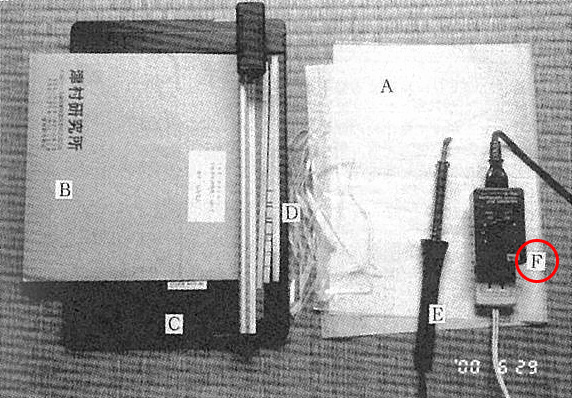 ヒートシールに使うハンダ鏝は前報のとおり、ラジオ用の先端(直径5mm)をいったん引き抜いて、平たく加工すればよい(Fig.1E).これはガスこんろとペンチと金槌があればできる。電流調節には、ハンダ鏝専用の小形コントローラーがある。私が購入したものは太洋電機産業製のパワーコントローラーPC-10(200W用)である(Fig.1F)。電灯用の調光器でもよい。これらはサイリスタ式のもので、最近は小形化したうえ安価になった。ラミントンで使われている接触抵抗式のコントローラーは、いつも同じつまみ位置を使うため、接触不良になって発熱することがある。サイリスク式にはその心配はないが、許容量より消費電力の大きい器具を使うと破壊される。またPC-10の場合には電源スイッチがついていないため、使用後はプラグから外しておかないと、常時電力を消費してしまうので注意せねばならない。電流調節はこういう出来合いのものがなければ、光量切り替えスイッチつきの電気スタンドを利用すればよい。