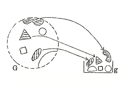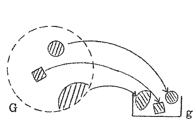 標本GSは実体Gの一部を切り取って固定したものである。このシリーズのはじめから私は「実体G」という言葉を用いているが、そういう明確な実在があると思ってもらっては困る。「実体G」は張り子の達磨のように、はっきりした界面をもってある領域を占有しているものではない。ある領域を占めてはいるけれど、その界面ははっきりしないのである。これはGの定義がアイマイな為である。しかしこれは命名者の定義がいい加減だということではない。Gはこの場合「種」を意味するから、種の定義の仕方が確立されていない為に、Gの領域が確定しないということである。図でGの輪郭を破線で描いているのはそのためである。Gを認識しgと名付けた者は自分なりにGの定義を下すが、共通の客観的基準がない以上、他人は彼が期待したとおりに理解しないかもしれないし、ご当人でも研究が進むに連れて、最初の定義ではうまくないということも起こってくる。極端に言えば、Gの定義は一人一人の好みで異なる。だから「牧野先生はこう言ったが中井博士はこう同定した」というようなはなしがよくおこるのである。このことは他分野の人からよく分類学の非科学性として批判されることであるが、これは分類学のセイではない。科学の水準が、種の定義を下せるほどに進んでいないだけの話である。それにもかかわらず生物にはいろいろな種があることは明らかなので、不完全でもなんでも定義を下さざるをえないのである。その損な役割を受け持つのが分類学という分野であるにすぎない。錬金術の時代に、元素を地水火風空と定義したのと同じである。
