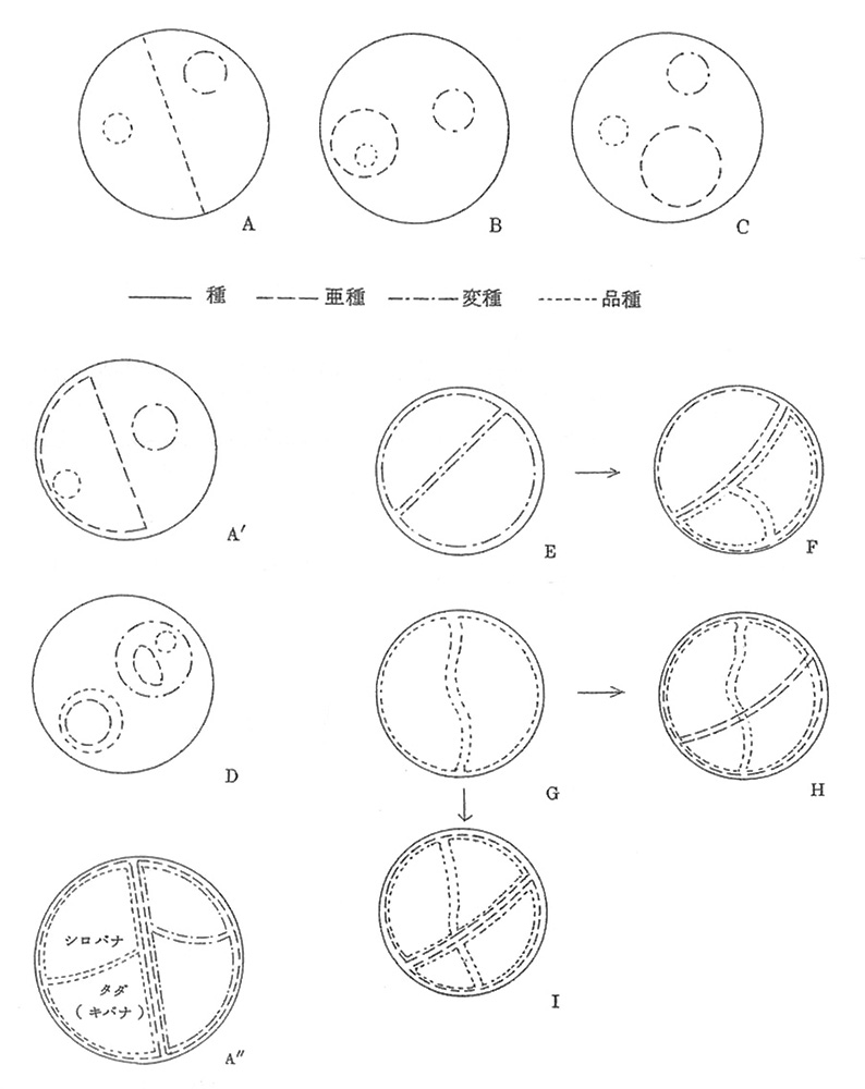 さてこう考えると、一方を縁石で仕切れば、自動的に残りも同じ縁石で仕切られることになる。これを図でやってみるとC′のようになる。この場合「残り」というのは「タダノカタバミ」であり、その中にもvar.もssp.も含まれ得る。だから縁石に囲まれたブロック塀や生垣ができてしまうのである。これは先の第2のルールに反する。ただしこのことは作図のしかたが議論に忠実でないから起こることである。種の中に変種でも亜種でも作れば、それに応じて「タダノ」に当たる変種や亜種が自動的にできるから、Cの図は正しくないのであって、A″のようになるべきである。このような図式を考えれば話が片づいたように見える。