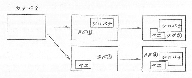 「シロバナ」というものを1つのランクと認めて囲うということは、もともと黄色い花だけと思っていた広場の片隅に白い花がみつかったので、黄色い花と白い花とをそれぞれ寄せ集めて、その間に縁石で境目を作ったのである。したがってこの境目は「シロバナ」のためにだけあるのではない。当然「キバナ」の方も囲っていることになる。つまりA′の図はまだ不完全でA″が本当の姿なのである。「シロバナ」を作った人は、自分が囲ったのは白花だけで、それ以外のものはみんな残りのところへ入っているものと考えているようだ。「タダノカタバミ」の一般的理解もそのようであるが、これは正しくないと思う。「タダノカタバミ」には黄花しか含まれていないのである。従って万一「アカバナ」が見つかったら、それは「タダ」の方からだけ出たのではなく、「シロバナ」の方からも出ているかも知れないのである。