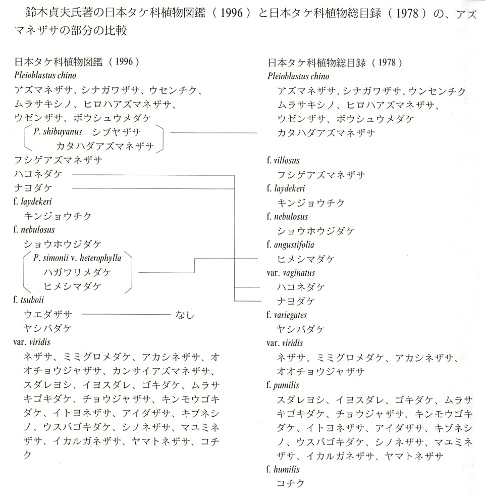 タケ・ササ類は栄養繁殖をするうえ、安心できる分類形質に欠けているため、多くの研究者によっておびただしい種が作られ、分類至難とされており、誰もがもっと整理されて当然と考えていながら敢て手をつける者がいなかった。本書は著者の永年の研究成果をまとめたもので、我国のタケ・ササ類をはじめて分類学的にまとめて扱ったものである。著者はこの類をタケ科としてイネ科から離し、13属95種を認めている。簡単な解説に続いて検索表が和文、英文で示されている。図譜は本書の主体をなすもので264頁にわたり、見開き2頁の片側に和英文による記相と分布図、生態写真、片側に図がのせられている。図は全形及び拡大図で、タケ・ササにふさわしい硬質な筆使いである。これに続いて著者の分類学的見解を示す、異名を含む学名一覧がある。種の大幅な統合を行なったにしては品種がかなり残されているが、園芸関係の利用に対する配慮であろう。高価な本なので広く誰でも利用するというわけには行かないが、今後のタケ・ササ顆の研究の土台となるものである。