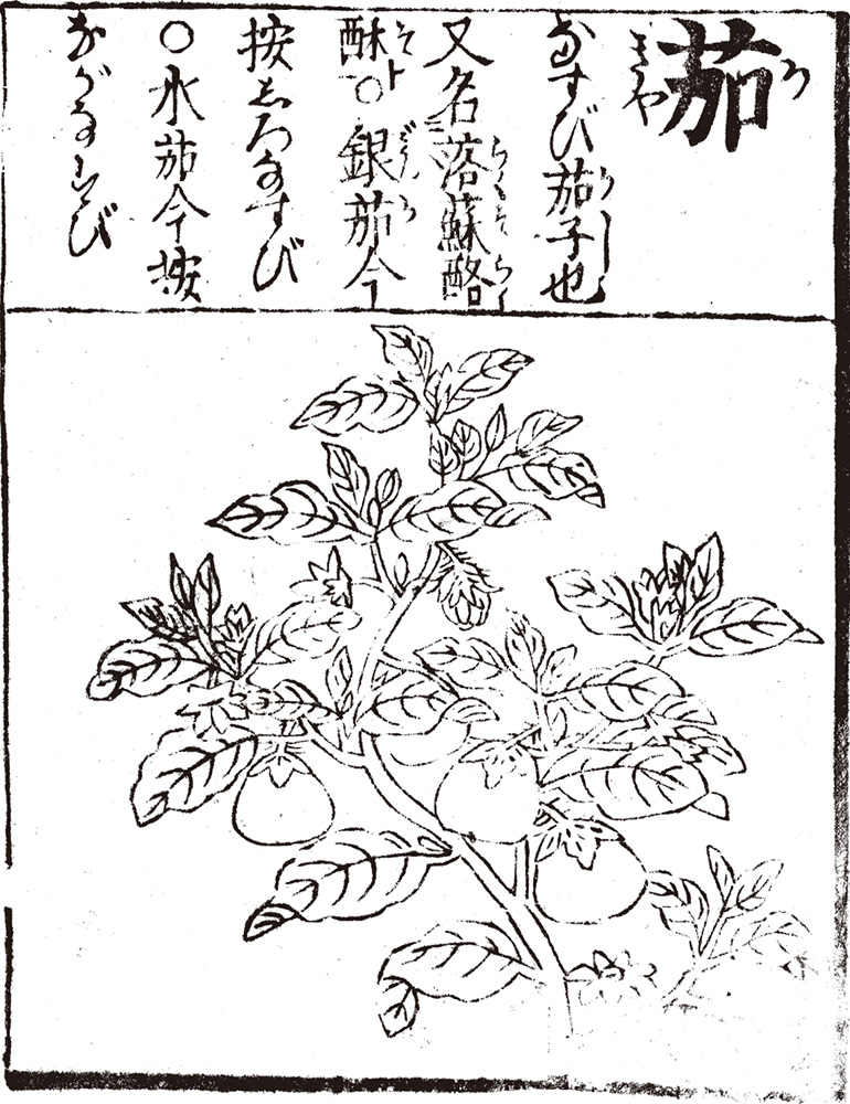 ナスは古くから重要な野菜の一つとされ、『本草和名』(918、延喜18年)及び『和名抄』(931、承平元年頃)に「和名奈須比」と記録されている。品種改良がしやすいため、古くから地域特有の品種が知られている。京都では丸い賀茂ナスが愛好され、江戸時代の百科図鑑に記された絵も丸形である[図版2]。