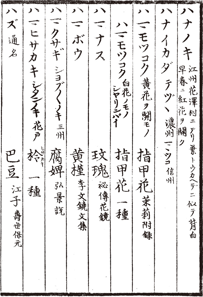 江戸時代後期になって『物品識名』(水谷豐文、1809、文化6年、尾張国、[図版3])に「ハマナス 玫瑰秘伝花鏡」と記載され、ハマナスが標準和名として全国に拡がった[図⓭]。
