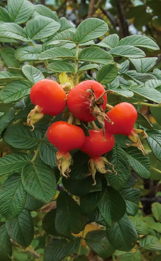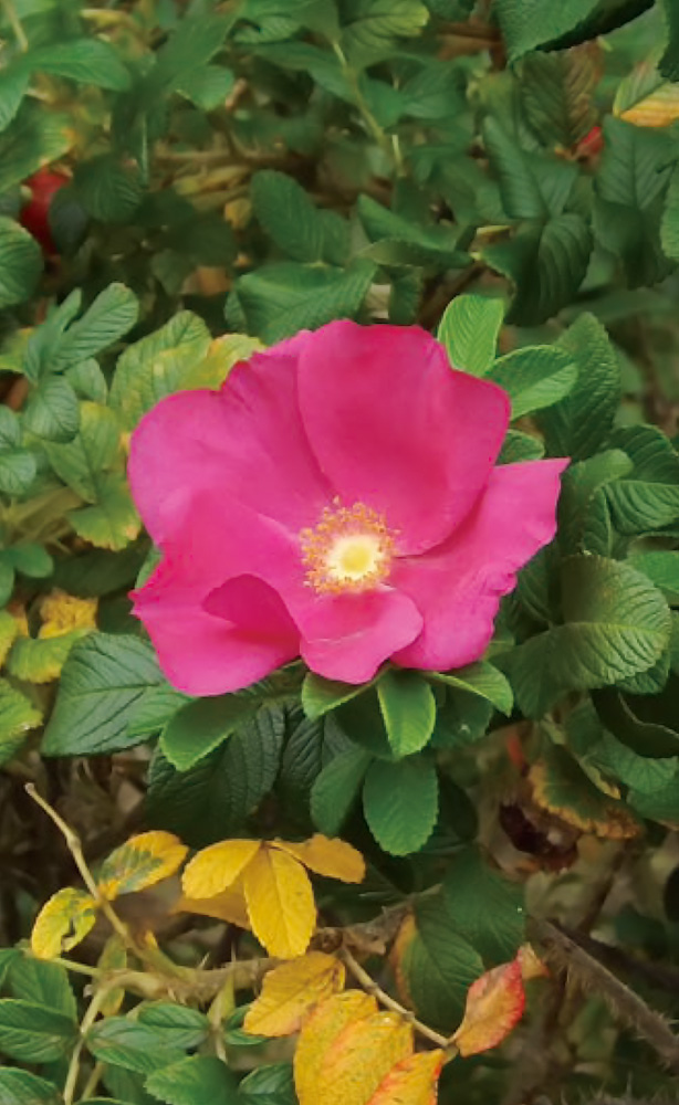 ハマナスは北海道と東北地方の海岸に普通に見られる落葉低木で、日本海岸では鳥取県、太平洋岸では茨城県まで野生している。砂地以外でも生育可能であり、内陸でも栽培されている[写真1]。夏から秋にかけて直径2〜3cmの扁球形果実を付け、真っ赤に熟す[写真2]。リンゴに似た味がして、ジャムや果実酒原料としても利用でき、アイヌ民族も食糧として利用した。その和名初出文献は『草花魚貝虫類写生図』(狩野常信、巻10、1667、寛文7年)とされている。