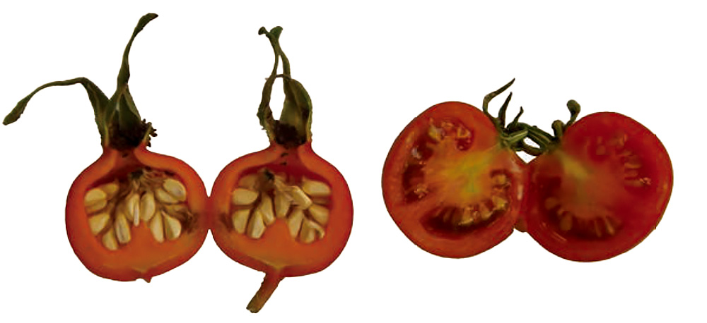 ハマナス果実とミニトマト果実はヘタの位置が逆である点を除くと、類似点が多い[写真5]。トマトに関する我が国最古の資料は狩野探幽が『草木花写生図巻』(1668、寛文8年)に描いた絵で、「唐なすび」の名が付されている。初めて見た異国の赤い果実に、先人がナスビの名を与えたことに注目して頂きたい(ナシでもカキでもない!)。