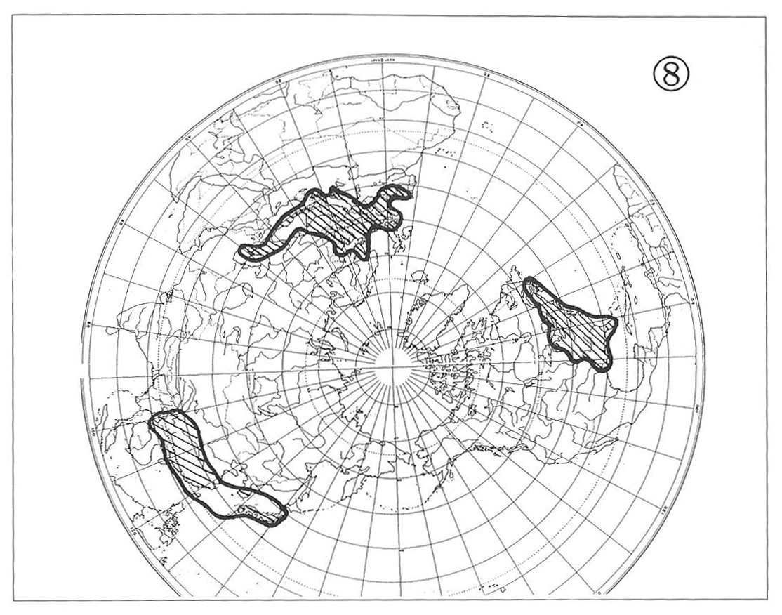 This type of distribution appears as a combination of the types (1) and (2) above, i.e., the North American ranges develop in both the eastern and the western parts of temperate North America, widely separated by the central and western portions of Mississippi River Basin and continued Rocky Mountains. The counterpart ranges in eastern Asia are similar to those of the two previous types. The genus Clintonia shows a typical example of this distributional pattern (Map 5). The distribution of Arabis lyrate (Map 6) may be attributed to this type. In this species, however, the ranges of its eastern American and western American subspecies meet in western Great Lakes Region, hence forming a continuous specific range simulant of the type (4) below.