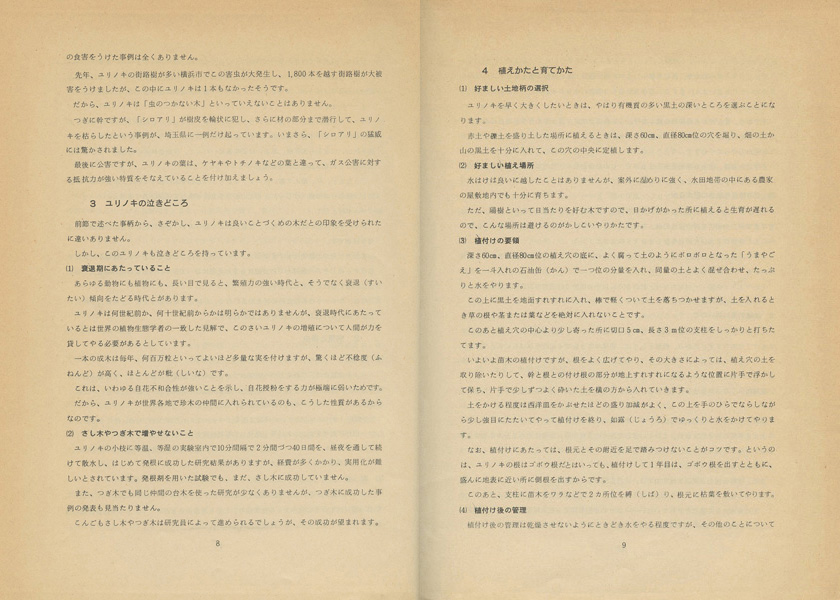 (注)(1)植え方、育て方はユリノキに準じてよいこと。(2)広い場所に単成木として植えるのが最も好ましいこと。(3)花数の多いヨシノザクラと同じく、老化が早いので、15~20年目毎に後継ぎ苗木(種子を春まきして簡単に苗が作れる。)を植えておくこと。