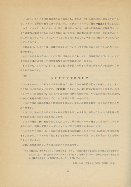 いっぽう、ユリノキは無数の木々の大調和のもとで形造っている森林の中心的な存在だとして、ドイツの世界的に有名な森林学者、シェンク氏がユリノキを『森林の貴族』と呼びました。