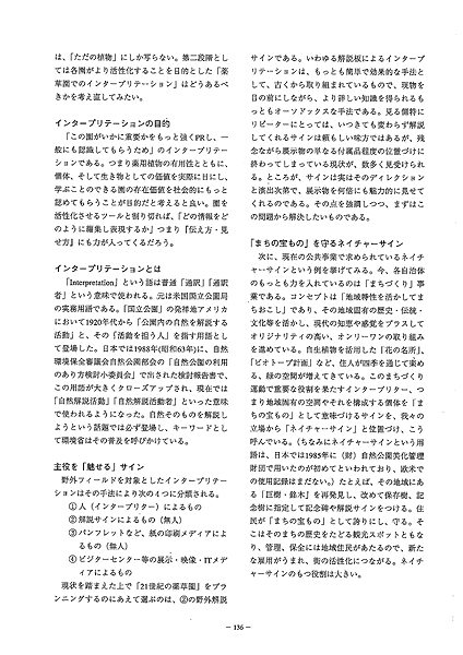 このネイチャーサイン®の考え方、植物園にも取り入れられないだろうか。平成7年10月「生物多様性国家戦略」が決定したが、種の保全と持続可能な利用をする上で、基礎的な情報が著しく不足している。動植物の分布の全体像も把握しにくくなっており、保護すべき種のうちどれほどが日本の植物園に保有・管理されているのかあまり知られていないのが現状である。これからの園では、保持する一つ一つの個体の価値を、日本全体から、文化的、歴史的背景から位置づけ、その重要性を一般に情報公開していく必要がある。植物そのものを「個体遺産」として評価し、「生きた遺産」ともいえる存在を園主導型で解説することが、園自らのステータスを上げることにもつながるのではなかろうか。大切なのは一般に「価値を意味づけた上で公開し、社会が評価し、認識する」というプロセスである。