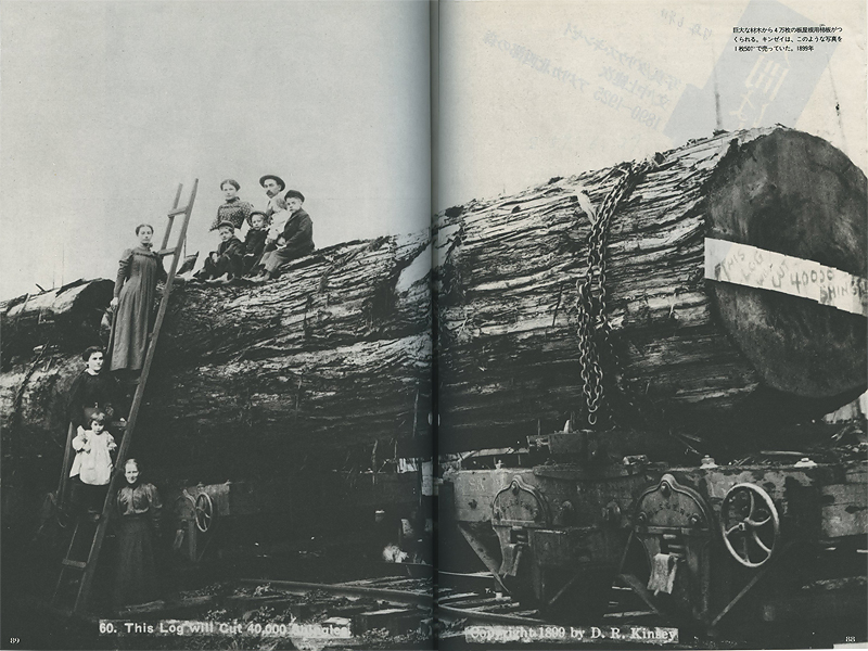 巨大な材木から4万枚の板屋根用柿(こけら)板がつくられる。キンゼイは、このような写真を1枚50セントで売っていた。1899年- (Image 3: 写真解説)