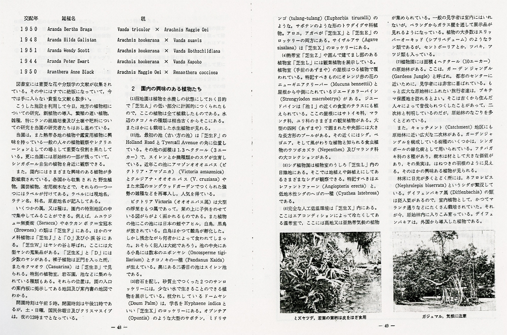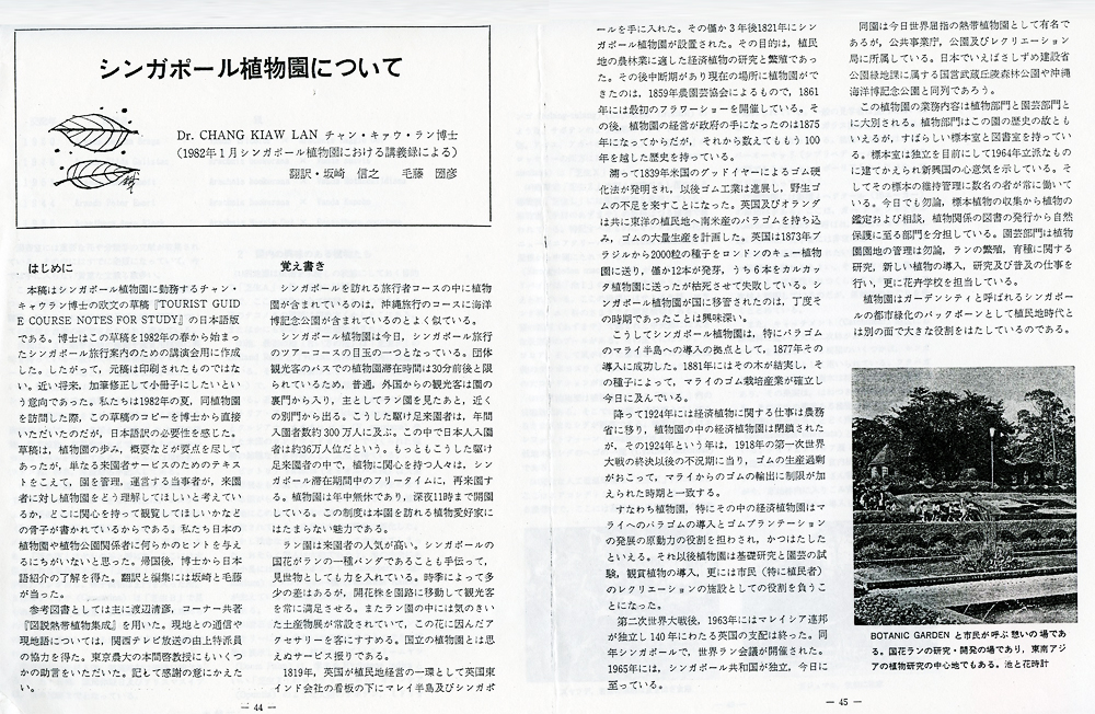 本稿はシンガポール植物園に勤務するチャン・キァウ・ラン博士の欧文の草稿『TOURIST GUIDE COURSE NOTES FOR STUDY』の日本語版である。博士はこの草稿を1982年の春から始まったシンガポール旅行案内のための講演会用に作成した。したがって、元稿は印刷されたものではない。近い将来、加筆修正して小冊子にしたいという意向であった。私たちは1982年の夏、同植物園を訪問した際、この草稿のコピーを博士から直接いただいたのだが、日本語訳の必要性を感じた。草稿は、植物園の歩み、概要などが要点を尽してあったが、単なる来園者サービスのためのテキストをこえて、園を管理、運営する当事者が、来園者に対し植物園をどう理解してほしいと考えているか、どこに関心を持って観覧してほしいかなどの骨子が書かれているからである。私たち日本の植物園や植物公園関係者に何らかのヒントを与えるにちがいないと思った。帰国後、博士から日本語紹介の了解を得た。翻訳と編集には坂嵜と毛藤が当った。