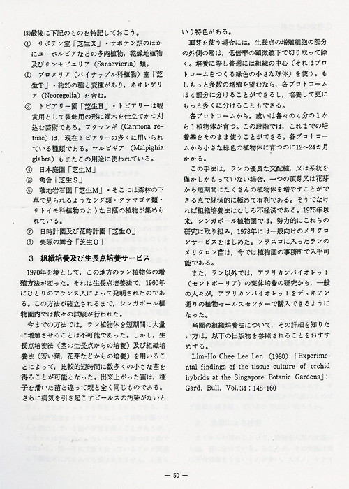 Lim-Ho Chee Lee Len (1980)「Experimental findings of the tissue culture of orchid hybrids at the Singapore Botanic Gardens」: Gard. Bull. Vol. 34 : 148-160