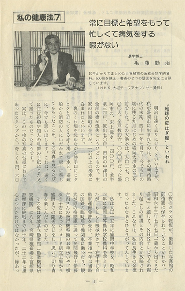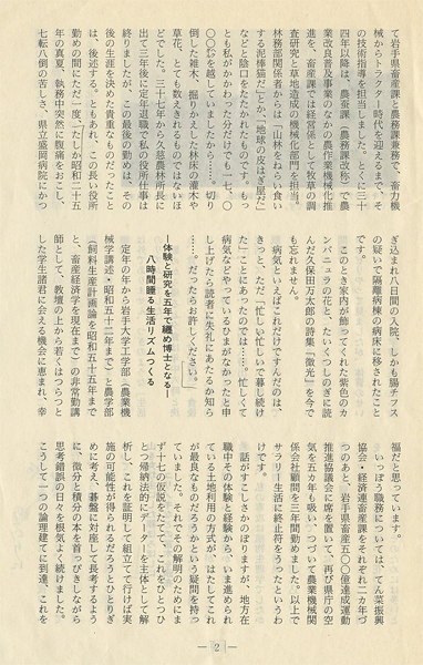 その後は宮城県立農業館(農業機械研究機関)い八年、宮崎県種蓄場と宮崎県畜産課に終戦までの十年、二十二年に里心がついたわけではなかったが、縁あって岩手県畜産課と農務課兼務で、畜力機械からトラクター時代を迎えるまで、その技術指導を担当しました。とくに三十四年以降は、農蚕課(農務課改称)で農業改良普及事業のなか農作業機械化推進を、畜産課では経営係として牧草の調査研究と草地造成の機械化部門を担当。林務部関係者からは「山林をねらい食いする泥棒猫だ」とか、「地球の皮はぎ屋だ」などと陰口をたたかれたものです。もっとも私がかかわった分だけでも一七、〇〇〇ヘクタールを越していましたから……。切り倒した雑木、掘りかえした林床の灌木や草花、とても数えきれるものではないほどでした。三十七年から久慈農林所長に出て三年後に定年退職で私の役所仕事は終りましたが、この最後の勤めは、その後の生涯を決めた貴重なものだったことは、後述する。ともあれ、この長い役所勤めの間にただ一度、たしか昭和二十五年の真夏、執務中突然に腹痛をおこし、七転八倒の苦しさ、県立盛岡病院にかつぎ込まれ八日間の入院、しかも腸チフスの疑いで隔離病棟の病床に移されたことです。