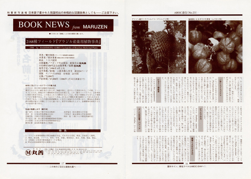 橋本先生はよわい80を迎えられたが、20歳の時に、志をもって渡伯された。この間、フィールドに立たれ、採集された植物標本は15万点を超える。この「橋本ハーバリウム」は世界的に貴重な財産である。この本はこれらの標本を元にした点、学名の移動などもきちんと整理した点が重要である。そして注目すべきは、2千以上の種類を薬用植物として括られた先生の視点である。これらの遺伝資源植物は、いまだに未知のものが多いから、興味ある多様な野生植物が続々と登場してくるに違いない。薬学や分類はもとより、資源植物を研究する人々の待望の著である。