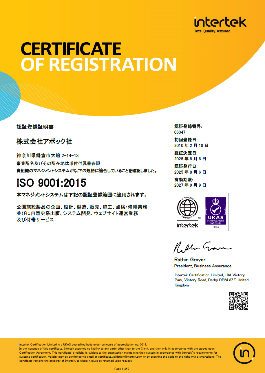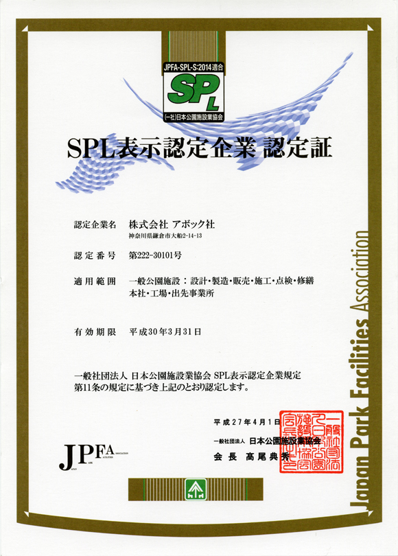 2010年4月1日、公園施設および遊具安全のための品質マネジメントシステムの規格「SP及びSPL表示認定」の認証を取得しました。
