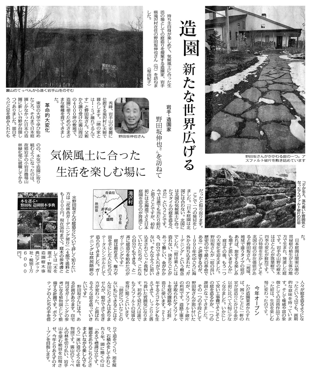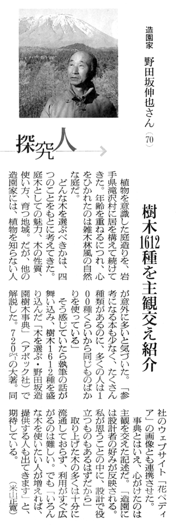 「樹木1612種を主観交え紹介~造園家 野田坂伸也さん(70)」―2012年1月12日の朝日新聞全国版(科学欄・探究人)に『木を選ぶ・野田坂造園樹木事典』の著者 野田坂伸也氏が紹介されました。(米山正寛氏)