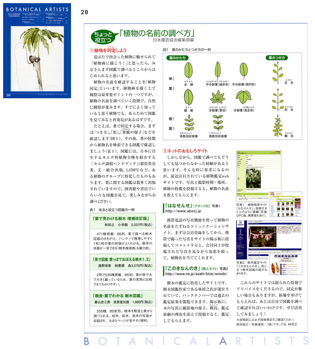 「ちょっと役立つ植物の名前の調べ方」―2012年3月1日発行のBOTANICAL ARTISTS 春号に、運営サイト「はなせんせ」が紹介されました。