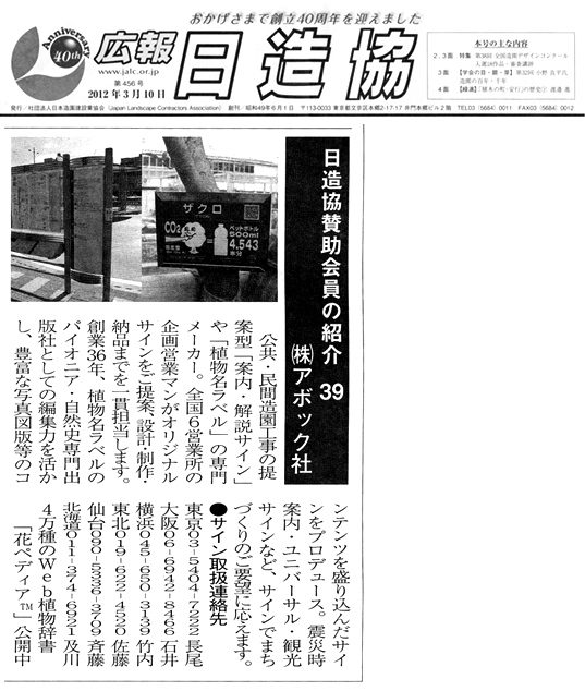 2012年3月10日発行の広報日造協(社団法人日本造園建設業協会発行)に、Abocが会員紹介されました。