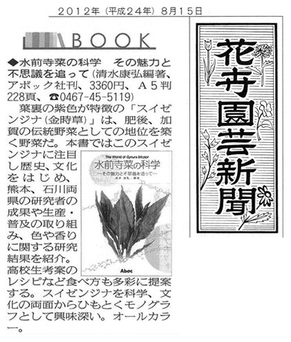 2012年8月15日発行の花卉園芸新聞に『水前寺菜の科学―その魅力と不思議を追って―』が紹介されました。