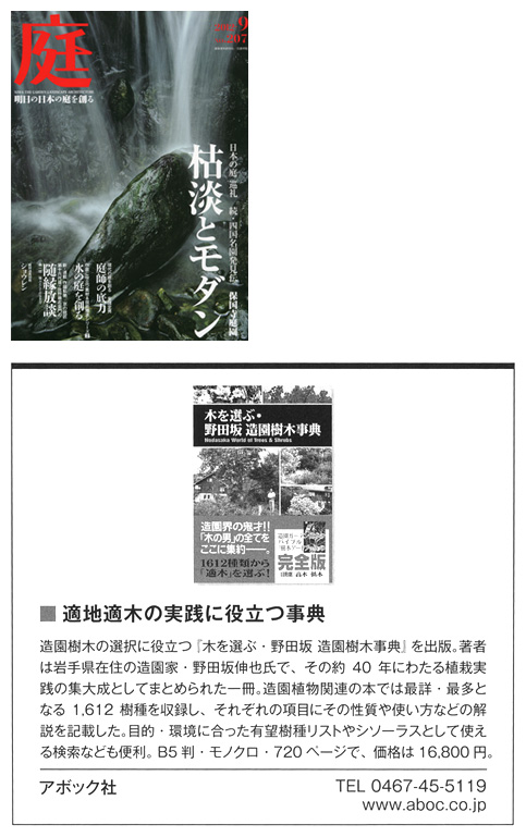 「適地適木の実践に役立つ事典」―2012年9月1日発行の庭 9月号に『木を選ぶ・野田坂造園樹木事典』が紹介されました。