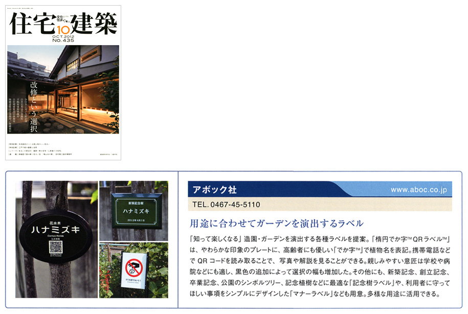 「用途に合わせてガーデンを演出するラベル」―2012年10月1日発行の住宅建築庭 10月号にAbocラベルが紹介されました。