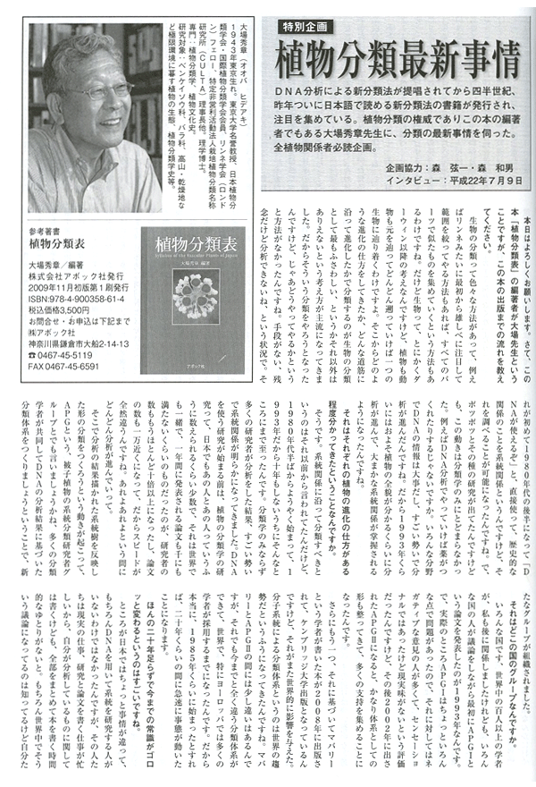 以下は、雑誌『山野草とミニ盆栽』2010年夏号(vol.81)に載った『植物分類表』編著者大場先生への編集部によるインタビュー記事です。 対談は四ページのうち一ページを、『植物分類表』よりの参考資料(一覧表)はそのままを紹介しました。詳しくは『山野草とミニ盆栽』誌と『植物分類表』をご覧ください。